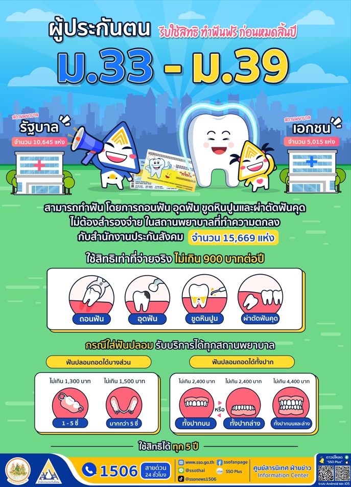 สำนักงานประกันสังคม เตือนผู้ประกันตนอย่าลืมไปใช้สิทธิกรณีทันตกรรม ก่อนหมดสิ้นปี 2567 โดยให้สิทธิผู้ประกันตนมาตรา 33 และมาตรา 39 ทำฟัน โดยการถอนฟัน อุดฟัน ขูดหินปูนและผ่าตัดฟันคุด ไม่ต้องสำรองจ่าย สามารถใช้สิทธิได้สูงสุด 900 บาทต่อคนต่อปี ไม่จำกัดจำนวนครั้ง ภายในวันที่ 31 ธันวาคม 2567 โดยสังเกตป้ายสติ๊กเกอร์ที่ระบุว่า สถานพยาบาลแห่งนี้ให้บริการผู้ประกันตนกรณีทันตกรรม “ทำฟัน” ไม่ต้องสำรองจ่าย