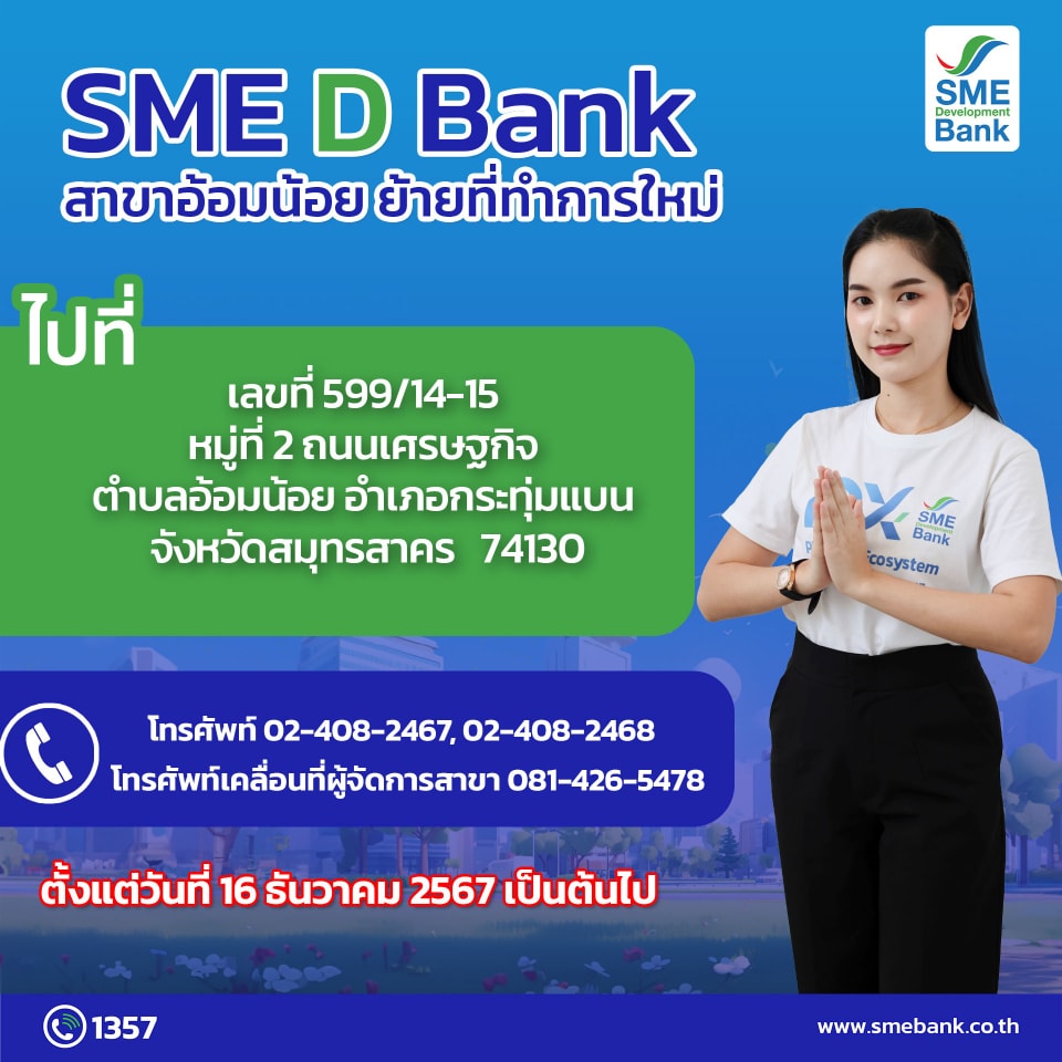 SME D Bank สาขาอ้อมน้อย ย้ายที่ทำการแห่งใหม่ ตั้งแต่วันที่ 16 ธันวาคม 2567 เป็นต้นไป