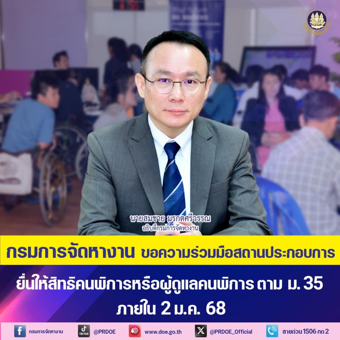 กรมการจัดหางาน ขอความร่วมมือสถานประกอบการแจ้งให้สิทธิคนพิการหรือผู้ดูแลคนพิการ ตามมาตรา 35 ปี 2568