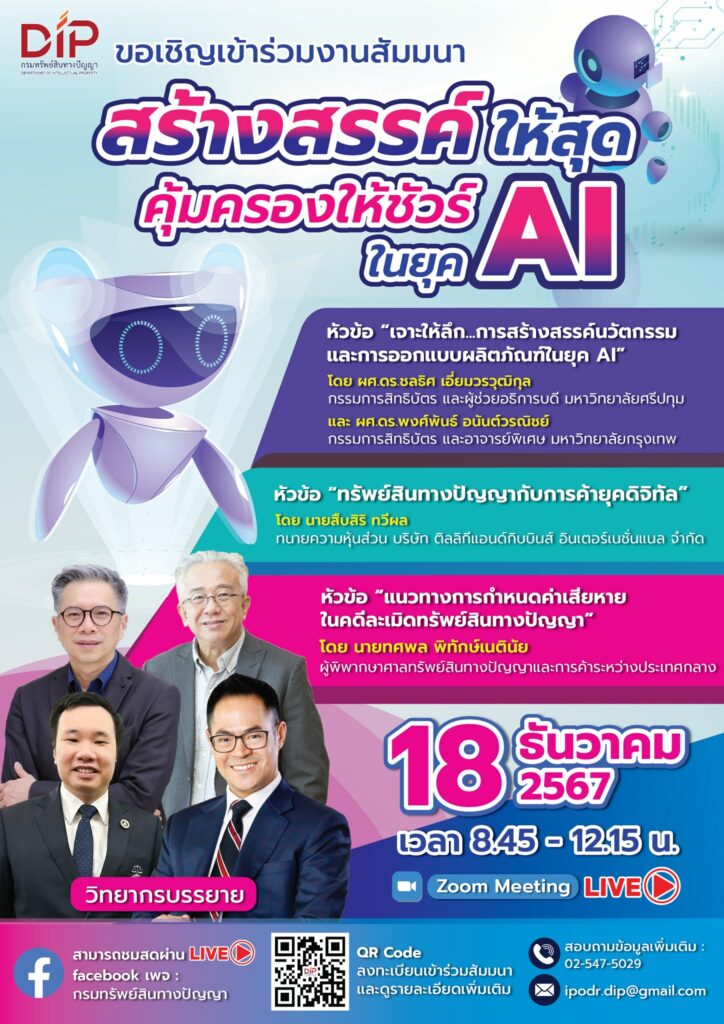กรมทรัพย์สินทางปัญญา ขอเชิญเข้าร่วมงานสัมมนา สร้างสรรค์ให้สุด คุ้มครองให้ชัวร์ ในยุค AI วันพุธที่ 18 ธันวาคม 2567 เวลา 08.45 น. – 12.15 น. รูปแบบออนไลน์ผ่านแอปพลิเคชัน Zoom และรับชมผ่านทาง เพจกรมทรัพย์สินทางปัญญา – https://www.facebook.com/ipthailand