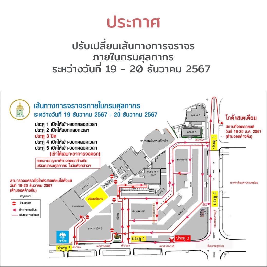 กรมศุลกากร ขอแจ้งการปรับเปลี่ยนเส้นทางจราจรภายในกรมศุลกากร วันที่ 19 – 20 ธันวาคม 2567 ประตู 1 เปิดให้เข้า ออกตลอดเวลา ประตู 2 เปิดให้ออกตลอดเวลา ประตู 3 ปิด ประตู 4 เปิดให้เข้า – ออกตลอดเวลา ประตู 5 เปิดให้เข้า – ออกตลอดเวลา (เข้าได้เฉพาะอาคารจอดรถ) ทั้งนี้ ขอความกรุณาห้ามจอดรถค้างคืน บริเวณกรมศุลกากร ในวันดังกล่าวฯ