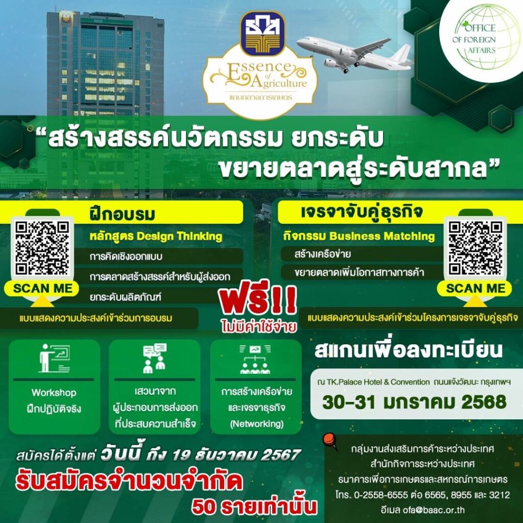 ธนาคารเพื่อการเกษตรและสหกรณ์การเกษตร จัดอบรม Design Thinking และกิจกรรม Business Matching ระหว่างวันที่ 30-31 มกราคม 2568 ณ TK. Palace Hotel & Convention ถนนแจ้งวัฒนะ กรุงเทพฯ เข้าร่วมฟรี สมัครได้ถึงวันที่ 19 ธันวาคม 2567