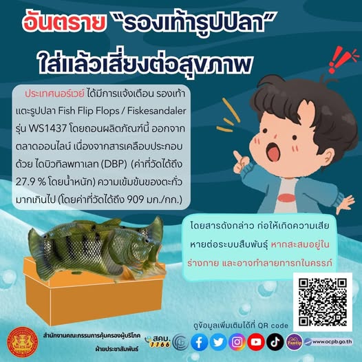 สำนักงานคณะกรรมการคุ้มครองผู้บริโภค เปิดเผยประเทศนอร์เวย์ ได้มีการแจ้งเตือน รองเท้าแตะรูปปลา Fish Flip Flops / Fiskesandaler รุ่น WS1437 โดยถอนผลิตภัณฑ์นี้ ออกจากตลาดออนไลน์ เนื่องจากสารเคลือบประกอบด้วย ไดบิวทิลพทาเลท (DBP) (ค่าที่วัดได้ถึง 27.9 % โดยน้ำหนัก) ความเข้มข้นของตะกั่วมากเกินไป (โดยค่าที่วัดได้ถึง 909 มก./กก.) โดยสารดังกล่าว ก่อให้เกิดความเสียหายต่อระบบสืบพันธุ์ หากสะสมอยู่ในร่างกาย และอาจทำลายทารกในครรภ์
