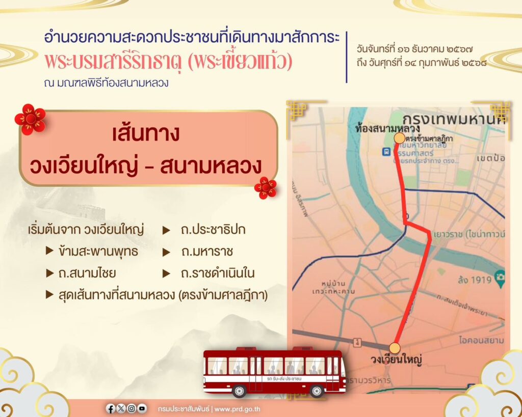 องค์การขนส่งมวลชนกรุงเทพ แจ้งปรับเปลี่ยนเวลาการเดินรถอำนวยความสะดวกประชาชนที่เดินทางมาสักการะพระบรมสารีริกธาตุ (พระเขี้ยวแก้ว) ในวันจันทร์ที่ 16 ธันวาคม 2567 ถึง วันศุกร์ที่ 14 กุมภาพันธ์ 2568 ณ มณฑลพิธีท้องสนามหลวง