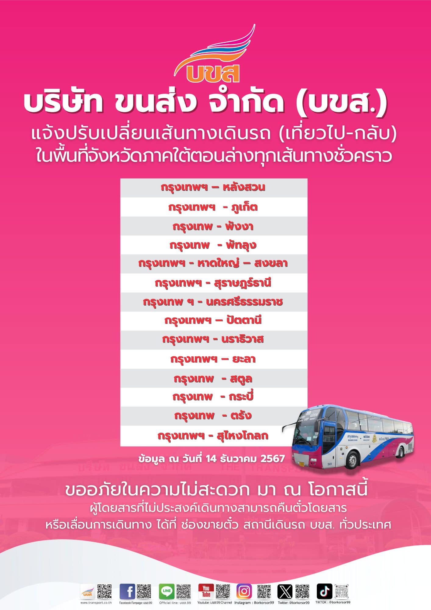 อย่างไรก็ตาม บขส. จะปรับเปลี่ยนเส้นทางเดินรถโดยสารไปภาคใต้ชั่วคราว ตั้งแต่วันนี้เป็นต้นไป จนกว่าสถานการณ์จะคลี่คลาย ทั้งนี้การปรับเปลี่ยนเส้นทางเดินรถอาจทำให้ล่าช้าในการเดินทาง บขส. ต้องกราบขออภัยไว้ ณ ที่นี้ด้วย และขอแนะนำให้ประชาชนตรวจสอบข้อมูลก่อนเดินทาง ส่วนผู้โดยสารที่ไม่ประสงค์จะเดินทางสามารถคืนตั๋วโดยสาร หรือเลื่อนการเดินทางได้ที่ สถานีเดินรถ บขส. ทั่วประเทศ สอบถามข้อมูลการเดินทางได้ที่ เบอร์โทร. 0 – 2936 – 3660 ในวันและเวลาราชการ หรือ ทาง Facebook Page : บขส. (www.facebook.com/BorKorSor99) และ Line : บขส.99 (Id : @TCL99)