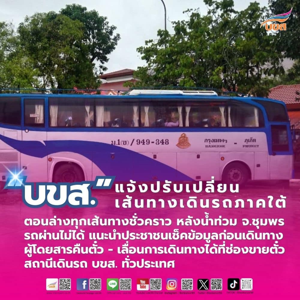 “บขส.” แจ้งปรับเปลี่ยนเส้นทางเดินรถภาคใต้ตอนล่างทุกเส้นทางชั่วคราว หลังน้ำท่วม จ.ชุมพร รถผ่านไม่ได้ แนะนำประชาชนเช็คข้อมูลก่อนเดินทาง – ผู้โดยสารคืนตั๋ว – เลื่อนการเดินทางได้