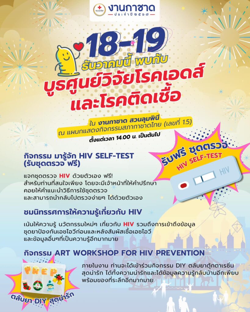 สภากาชาดไทย ร่วมออกบูธในงานงานกาชาด วันที่ 18-19 ธันวาคม 2567 ตั้งแต่เวลา 14.00 น. เป็นต้นไป ที่บูธ ศูนย์วิจัยโรคเอดส์และโรคติดเชื้อ สภากาชาดไทย แจกชุดตรวจ HIV ด้วยตัวเอง ฟรี ณ แผนกแสดงกิจกรรมสภากาชาดไทย (เลขที่ 1.5)