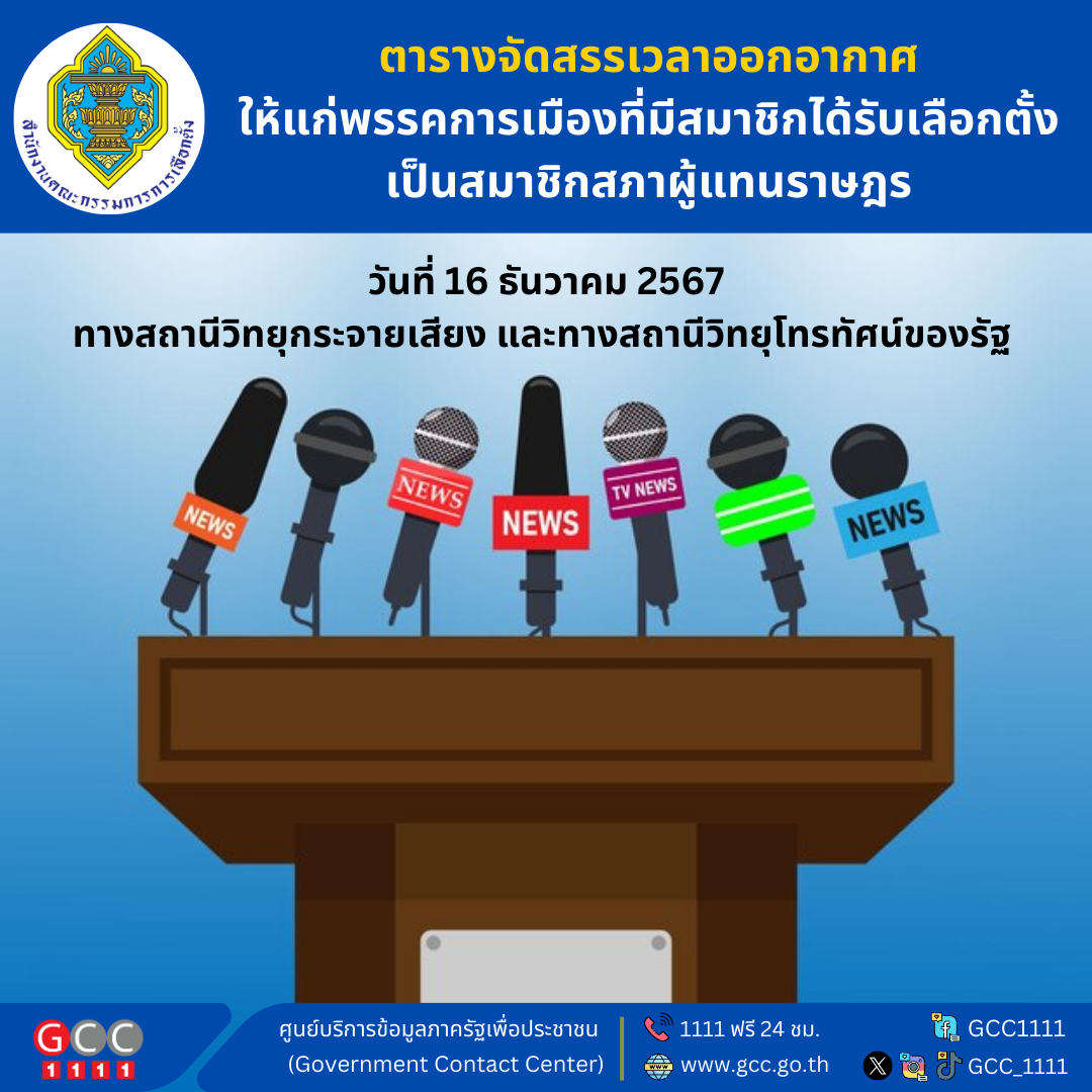 สำนักงานคณะกรรมการการเลือกตั้ง แจ้งตารางจัดสรรเวลาออกอากาศให้แก่พรรคการเมือง ที่มีสมาชิกได้รับเลือกตั้งเป็นสมาชิกสภาผู้แทนราษฎรทางสถานีวิทยุกระจายเสียง และทางสถานีวิทยุโทรทัศน์ของรัฐ ตามมาตรา 86 แห่งพระราชบัญญัติประกอบรัฐธรรมนูญว่าด้วยพรรคการเมือง พ.ศ. 2560 วันที่ 16 ธันวาคม 2567