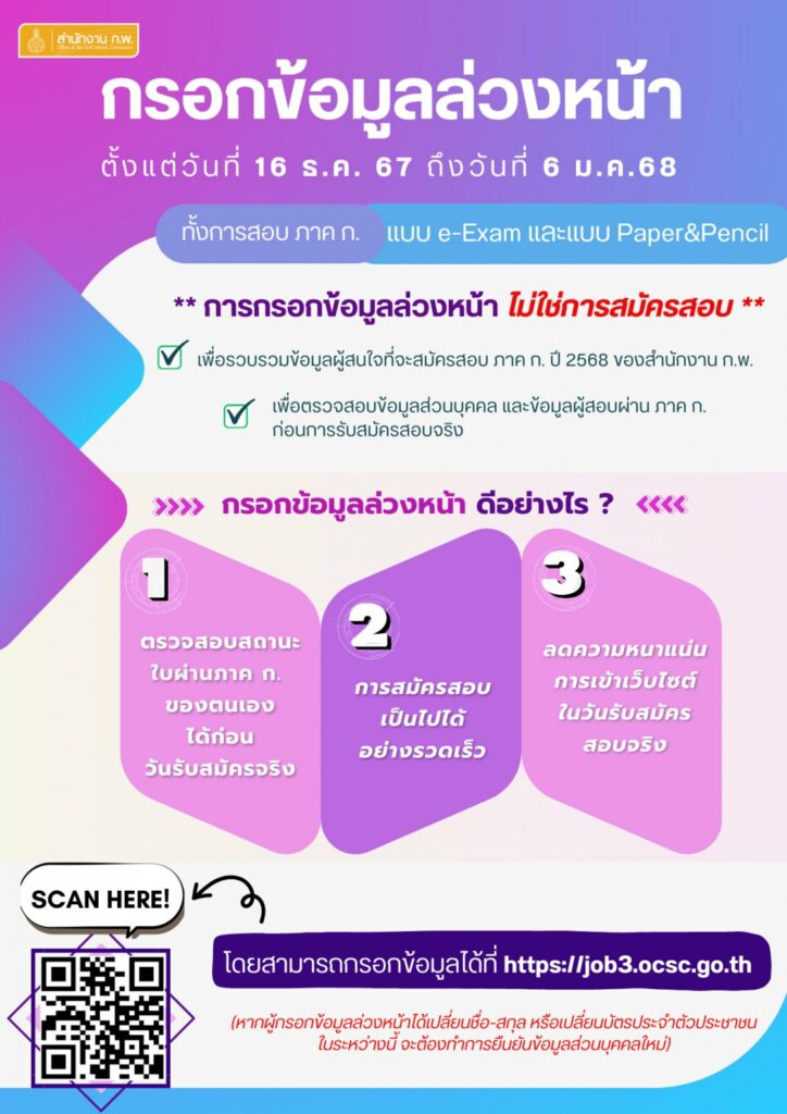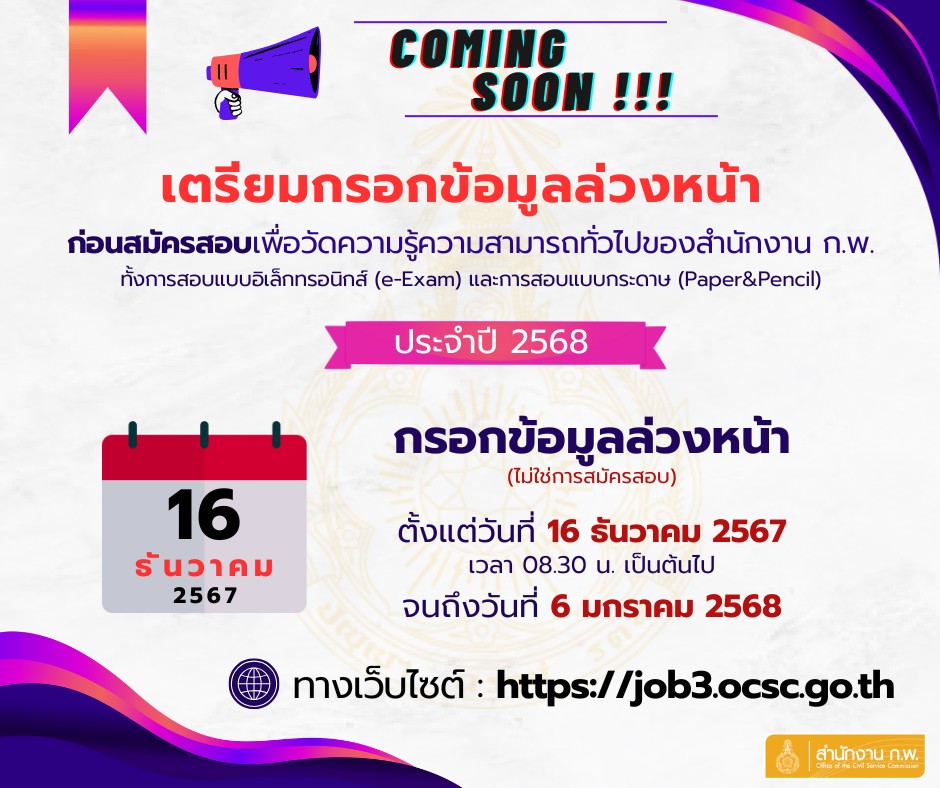 สำนักงานคณะกรรมการข้าราชการพลเรือน แจ้งปฏิทินการสมัครสอบเพื่อวัดความรู้ความสามารถทั่วไป ประจำปี 2568 โดยเริ่มกรอกข้อมูลล่วงหน้าได้ ผ่านเว็บไซต์ https://job3.ocsc.go.th ตั้งแต่วันที่ 16 ธันวาคม 2567 ถึง วันที่ 6 มกราคม 2568 เพื่อความสะดวกรวดเร็วและลดเวลาในวันสมัครสอบจริง ทั้งการสอบแบบ Paper & Pencil และ e-Exam หมายเหตุ: “การกรอกข้อมูลล่วงหน้า” เป็นเพียงการอำนวยความสะดวกให้ผู้สมัครสอบไม่ต้องกรอกข้อมูลจำนวนมากและลดระยะเวลาในวันสมัครสอบจริงเท่านั้น **ยังไม่ใช่การสมัครสอบภาค ก.** ติดตามประกาศและรายละเอียดการรับสมัครสอบผ่านทางเว็บไซต์ https://job3.ocsc.go.th หรือ Facebook Page สำนักงาน ก.พ.