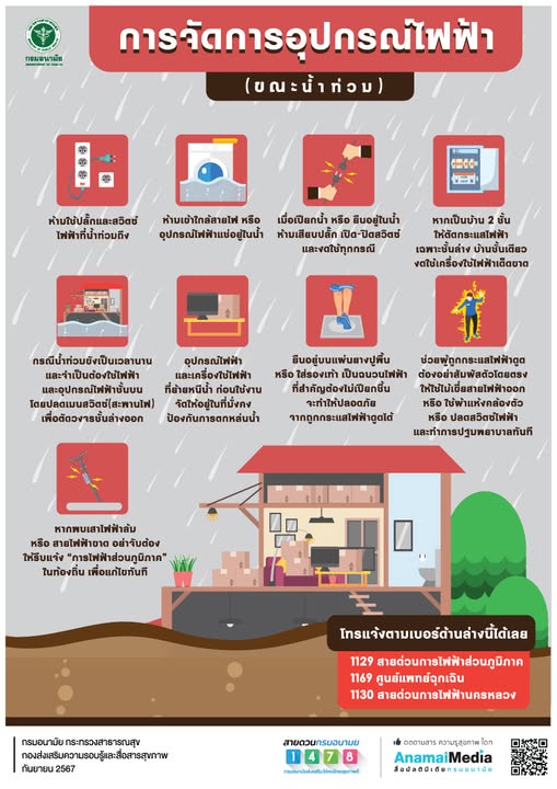 กรมอนามัย แจ้งเตือนการจัดการอุปกรณ์ไฟฟ้า (ขณะน้ำท่วม) สำหรับผู้ที่กำลังประสบภัยน้ำท่วม ไม่สามารถไปไหนได้ ควรงดใช้ไฟฟ้า เครื่องมือและอุปกรณ์ไฟฟ้าทุกชนิดโดยเด็ดขาด