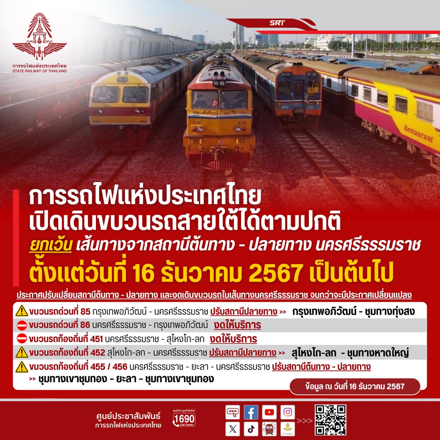 การรถไฟแห่งประเทศไทย ประกาศงดเดินขบวนรถจำนวน 2 ขบวน และปรับเปลี่ยนสถานีต้นทาง-ปลายทาง จำนวน 4 ขบวน เป็นการชั่วคราว ตั้งแต่วันที่ 16 ธันวาคม 2567 เป็นต้นไป จนกว่าสถานการณ์จะคลี่คลายและมีประกาศเปลี่ยนแปลง เนื่องจากสถานการณ์น้ำท่วมในพื้นที่จังหวัดนครศรีธรรมราช ยังส่งผลกระทบต่อการเดินขบวนรถ