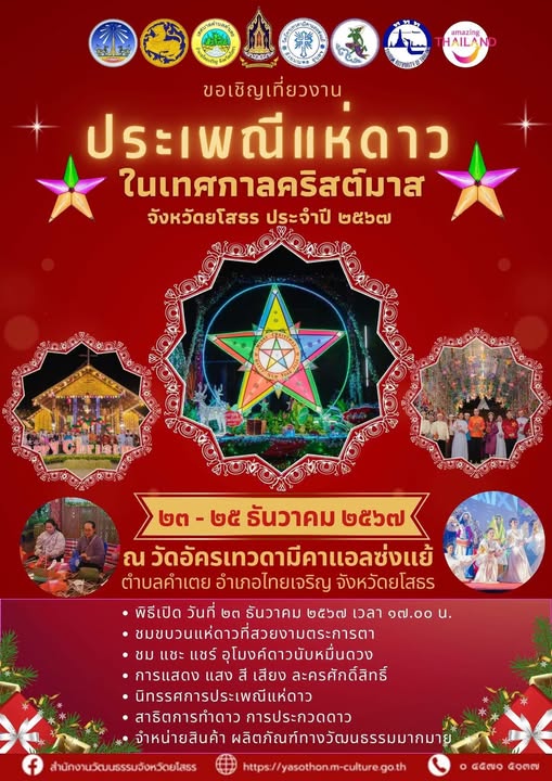 การท่องเที่ยวแห่งประเทศไทย ขอเชิญเที่ยวงานประเพณีแห่ดาวในเทศกาลคริสต์มาส จังหวัดยโสธร ประจำปี 2567 ระหว่างวันที่ 23 – 25 ธันวาคม 2567 ณ วัดอัครเทวดามีคาแอลซ่งแย้ อำเภอไทยเจริญ จังหวัดยโสธร
