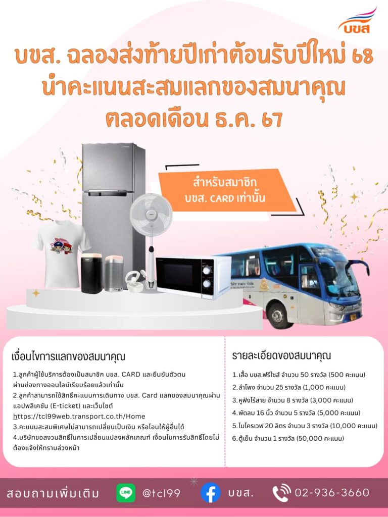 บริษัท ขนส่ง จำกัด ฉลองส่งท้ายปีเก่าต้อนรับปีใหม่ 2568 นำคะแนนสะสม “บขส. Card” แลกของสมนาคุณ ตั้งแต่บัดนี้ – 31 ธันวาคม 2567 ผ่านช่องทาง เว็บไซต์ tcl99web.transport.co.th หรือ Application : E – Ticket