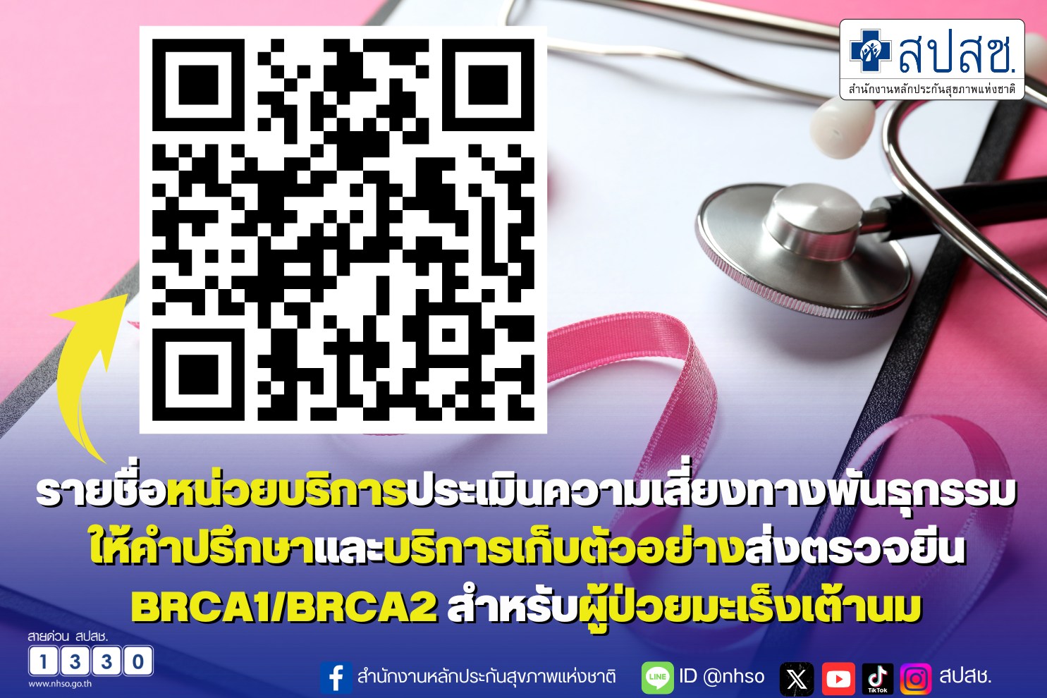 สำนักงานหลักประกันสุขภาพแห่งชาติ เปิดรายชื่อหน่วยบริการ ที่เข้าร่วมเป็นหน่วยบริการประเมินความเสี่ยงทางพันธุกรรม บริการให้คำปรึกษาและบริการเก็บตัวอย่างส่งตรวจยีน BRCA1/BRCA2 สำหรับผู้ป่วยมะเร็งเต้านมที่มีความเสี่ยงสูงและญาติสายตรงฯ ในระบบหลักประกันสุขภาพแห่งชาติ ปีงบประมาณ 2568
