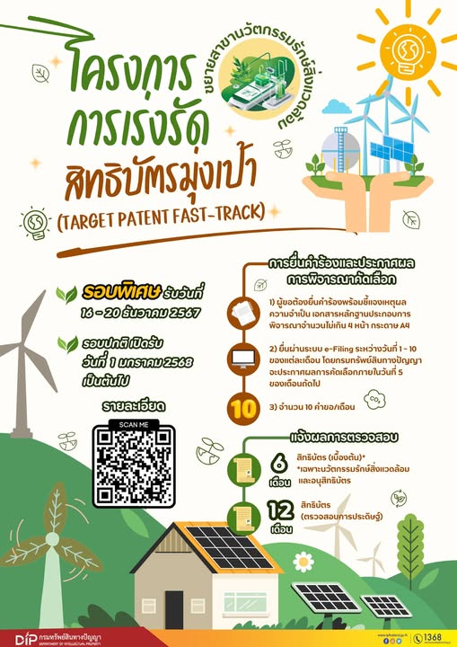 กรมทรัพย์สินทางปัญญา โครงการการเร่งรัดสิทธิบัตรมุ่งเป้า (target patent fast-track) ขยายสาขานวัตกรรมรักษ์สิ่งแวดล้อม