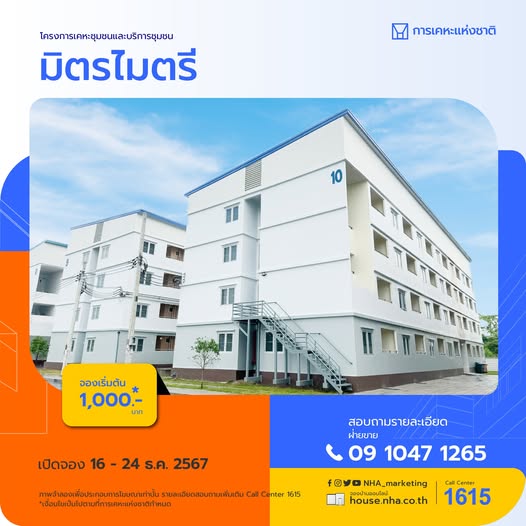 การเคหะแห่งชาติ เปิดจองโครงการเคหะชุมชนและบริการชุมชนมิตรไมตรี บัดนี้ – 24 ธันวาคม 2567