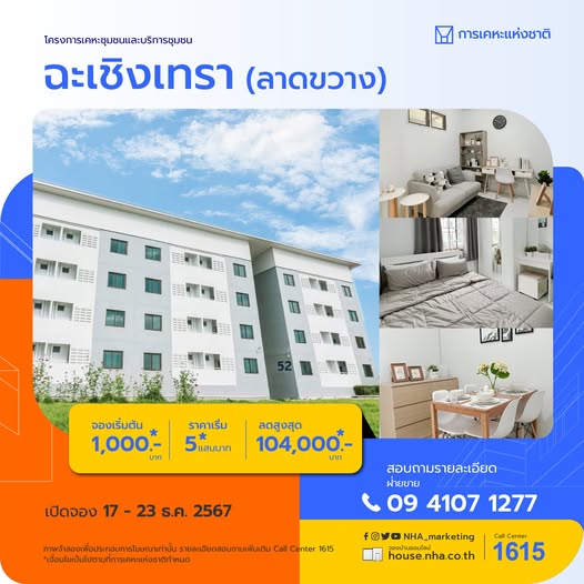 การเคหะแห่งชาติ เปิดจองโครงการเคหะชุมชนและบริการชุมชนฉะเชิงเทรา (ลาดขวาง) บัดนี้ – 23 ธ.ค. 67