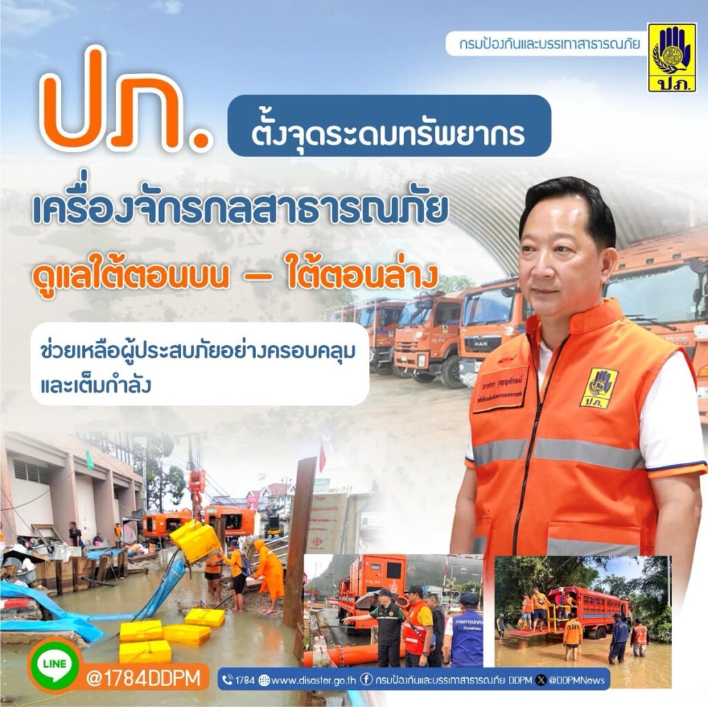 ปภ. สั่งตั้งจุดระดมทรัพยากรเครื่องจักรกลสาธารณภัย 2 จุดใหญ่ ในพื้นที่ภาคใต้ เพื่อระดมสรรพกำลังให้ความช่วยเหลือเหตุอุทกภัยครอบคลุมพื้นที่ภาคใต้ทั้งตอนบนและตอนล่าง