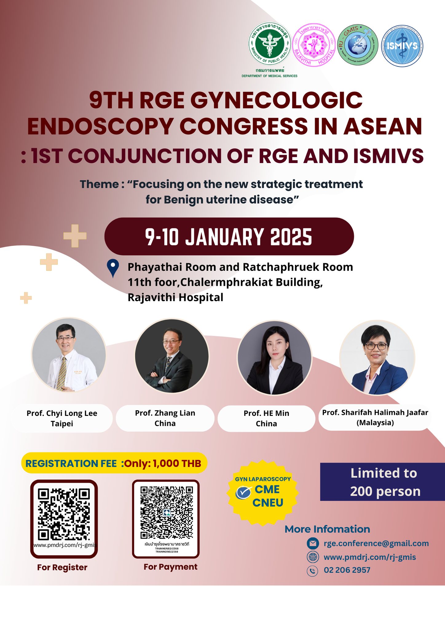 โรงพยาบาลราชวิถี กรมการแพทย์ ขอเชิญลงทะเบียนเข้าร่วม โครงการประชุมวิชาการประจำปีการผ่าตัดผ่านกล้องทางนรีเวช 9th RGE Gynecologic Endoscopy congress in ASEAN ระหว่างวันที่ 9 – 10 มกราคม 2568 ณ ห้องประชุมพญาไท และห้องประชุมโยธี ชั้น 11 อาคารเฉลิมพระเกียรติฯ โรงพยาบาลราชวิถี