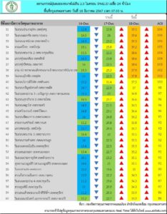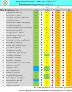- ประจำวันพุธที่ 18 ธันวาคม พ.ศ. 2567 เวลา 07.00 น. ค่าเฉลี่ย 24 ชั่วโมง ของฝุ่นละอองขนาดไม่เกิน 2.5 ไมครอน (PM2.5)