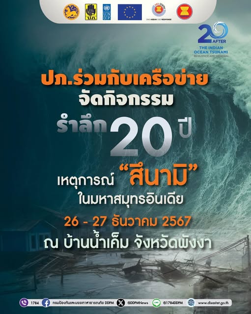 กรมป้องกันและบรรเทาสาธารณภัย (ปภ.) กระทรวงมหาดไทย ร่วมกับหน่วยงานภาคีเครือข่าย เตรียมจัดงานรำลึก 20 ปี เหตุการณ์สึนามิในมหาสมุทรอินเดีย (The Commemoration of the 20th Anniversary of Indian Ocean Tsunami) ในวันที่ 26 – 27 ธ.ค. 2567 ณ จังหวัดพังงา เพื่อรำลึกถึงผู้สูญเสียและผู้ได้รับผลกระทบจากเหตุการณ์สึนามิในมหาสมุทรอินเดีย แสดงความก้าวหน้าของระบบการบริหารจัดการและแจ้งเตือนภัยสึนามิของประเทศไทย สร้างความตระหนักรู้และกระตุ้นให้เกิดการเตรียมพร้อมรับมือเหตุสึนามิที่อาจเกิดขึ้นในอนาคต รวมถึงส่งเสริมความร่วมมือระหว่างภาคีเครือข่ายทั้งในระดับประเทศและต่างประเทศในการลดความเสี่ยงจากภัยสึนามิ ตลอดจนเป็นเวทีในการแลกเปลี่ยนความรู้ ประสบการณ์ และแนวทางการเตรียมพร้อมรับมือและบริหารจัดการเมื่อเกิดภัยสึนามิ เพื่อนำไปสู่การผนึกกำลังของทุกภาคส่วนอย่างเข้มแข็งในการสร้างสังคมไทยที่ปลอดภัยจากภัยพิบัติอย่างยั่งยืน