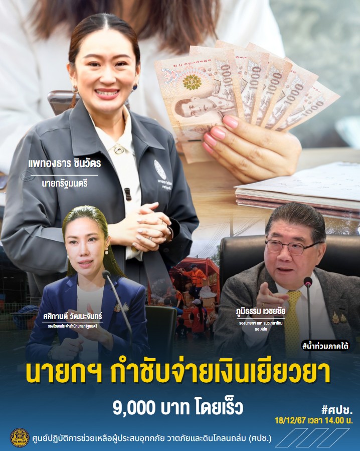 “ท่านรองนายกรัฐมนตรีและรัฐมนตรีว่าการกระทรวงกลาโหม นายภูมิธรรม เวชยชัย ในฐานะผู้อำนวยการศูนย์ปฏิบัติการช่วยเหลือผู้ประสบอุทกภัย วาตภัย และดินโคลนถล่ม (ศปช.) ได้รับทราบข้อสั่งการของนายกรัฐมนตรี และได้กำชับไปยังหน่วยงานที่เกี่ยวข้องเร่งดำเนินการทันที โดยเฉพาะการเยียวยาช่วยเหลือผู้ประสบภัย ให้จังหวัดเร่งดำเนินการช่วยเหลือตามระเบียบเงินทดรองราชการฯ และการให้ความช่วยเหลือกรณีพิเศษตามมติ ครม. เมื่อวันที่ 3 ธ.ค. 67 ในการจ่ายเงินช่วยเหลือผู้ประสบภัยในช่วงฤดูฝน ปี 2567 ครัวเรือนละ 9,000 บาทโดยเร็วที่สุด” นางสาวศศิกานต์ กล่าว