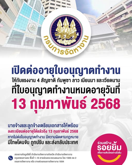 กรมการจัดหางานเปิดต่ออายุใบอนุญาตทำงานสำหรับแรงงาน 4 สัญชาติ กัมพูชา ลาว เมียนมา และเวียดนาม ที่ใบอนุญาตทำงานหมดอายุ ในวันที่ 13 กุมภาพันธ์ 2568 ให้สามารถทำงานได้อย่างต่อเนื่อง ได้รับสวัสดิการ มีหลักประกันทางสังคม” นายจ้างและลูกจ้างเตรียมเอกสารให้พร้อมและปฏิบัติตามขั้นตอนต่างๆ ติดตามขั้นตอนการยื่นขอใบอนุญาตทำงานได้ที่ www.doe.go.th หากไม่ต่อใบอนุญาตทำงาน มีความผิดตามกฏหมาย มีโทษโดนจับ ถูกปรับ และส่งกลับประเทศ