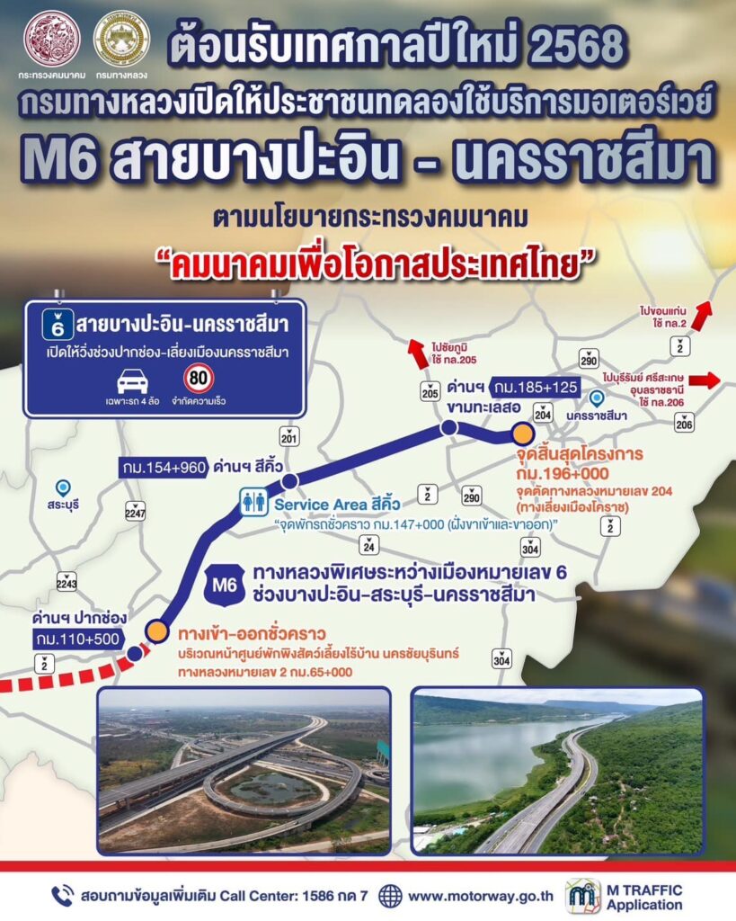 กรมทางหลวง เปิดให้ประชาชนทดลองใช้ทางหลวงพิเศษระหว่างเมือง สายบางปะอิน – นครราชสีมา (M6) อย่างต่อเนื่อง