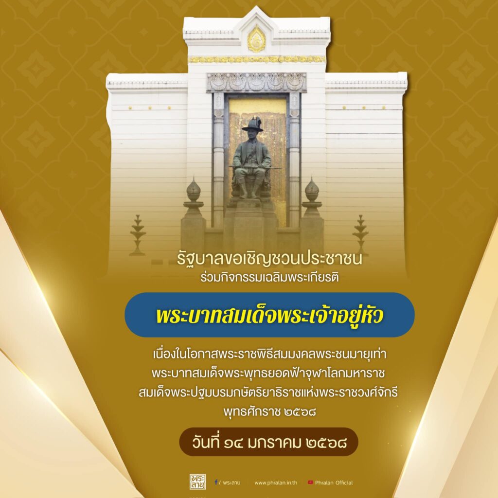 รัฐบาล ขอเชิญชวนประชาชน ร่วมกิจกรรมเฉลิมพระเกียรติพระบาทสมเด็จพระเจ้าอยู่หัว เนื่องในโอกาสพระราชพิธีสมมงคลพระชนมายุเท่าพระบาทสมเด็จพระพุทธยอดฟ้าจุฬาโลกมหาราช สมเด็จพระปฐมกษัตริยาธิราชแห่งพระราชวงศ์จักรี พุทธศักราช 2568 ในวันที่ 14 มกราคม 2568