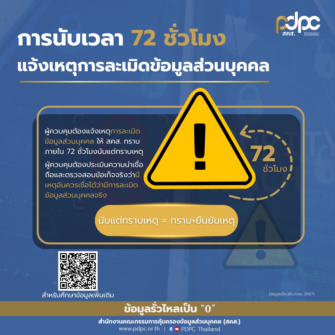ผู้ควบคุมมีหน้าที่ต้องแจ้งเหตุการละเมิดข้อมูลส่วนบุคคล (Data Breach) ให้ สคส. ทราบ ภายใน 72 ชั่วโมงนับแต่ทราบเหตุเท่าที่สามารถกระทำได้