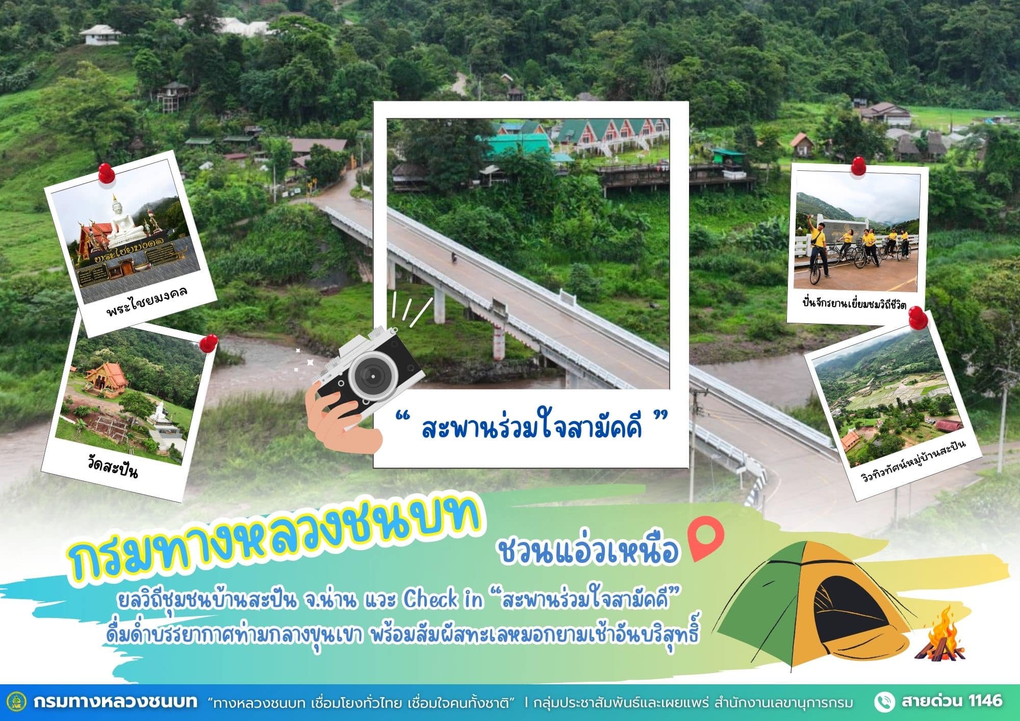 กรมทางหลวงชนบท (ทช.) ชวนประชาชนขึ้นเหนือ ยลวิถีชีวิตของประชาชนในหมู่บ้านสะปัน อำเภอบ่อเกลือ จังหวัดน่าน แวะเช็กอินบน “สะพานร่วมใจสามัคคี” ท่ามกลางขุนเขาที่โอบล้อม และม่านหมอกที่ปกคลุม พร้อมแวะพักโฮมสเตย์ เพื่อรอดื่มด่ำกับบรรยากาศของธรรมชาติยามเช้าอันบริสุทธิ์ นายมนตรี เดชาสกุลสม อธิบดีกรมทางหลวงชนบท เปิดเผยว่า “สะพานร่วมใจสามัคคี” เป็นสะพานของกรมทางหลวงชนบท ที่พาดผ่านจุดบรรจบของคลองข่า และลำน้ำว้า ลำน้ำสายสำคัญที่จะไหลไปบรรจบยังแม่น้ำน่าน ซึ่งเป็นสายน้ำที่ยาวที่สุดกว่าทุกสายก่อนไหลบรรจบเป็นแม่น้ำเจ้าพระยา โดยตั้งอยู่ในหมู่บ้านสะปัน ตำบลดงพญา อำเภอบ่อเกลือ จังหวัดน่าน ก่อสร้างขึ้นเมื่อ พ.ศ. 2562 เพื่อยกระดับการเดินทางที่สะดวกปลอดภัยให้กับประชาชนในพื้นที่ โดยเฉพาะนักท่องเที่ยว เนื่องจากสะปัน กลายเป็นหมุดหมายสำคัญแห่งใหม่ที่นักท่องเที่ยวต่างใฝ่ฝันที่จะมาเยือน เพราะด้วยวิถีชีวิตที่เรียบง่าย เงียบสงบ บรรยากาศอันสดชื่นบริสุทธิ์ พร้อมมีโฮมสเตย์รองรับที่คงเอกลักษณ์และมนต์เสน่ห์ความเป็นภาคเหนือได้อย่างลงตัว ซึ่งเหมาะแก่การหาสถานที่ฮีลใจเป็นอย่างมาก ที่สำคัญสะพานร่วมใจสามัคคียังเชื่อมไปยังแหล่งท่องเที่ยวมากมาย ไม่ว่าจะเป็น น้ำตกสะปันที่แสนร่มรื่นเย็นสบาย อุทยานแห่งชาติขุนน่าน อันเป็นต้นกำเนิดของลำน้ำว้า และวัดสะปัน สถานที่ประดิษฐานพระไชยมงคล รวมทั้งเป็นจุดกางเต็นท์ที่สามารถชมวิวทิวทัศน์ของบ้านสะปันจากมุมสูงได้อีกด้วย