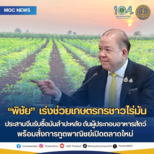 กระทรวงพาณิชย์ เร่งช่วยเกษตรกรชาวไร่มัน ประสานทางการจีนรับซื้อมันสำปะหลัง ดันผู้ประกอบอาหารสัตว์ใช้มันเส้นเพิ่ม พร้อมขอให้สมาคมผู้ผลิตอาหารสัตว์ไทยเพิ่มจำนวนรับซื้อมันเส้น และสั่งการทูตพาณิชย์ให้หาตลาดล่วงหน้า เน้นเปิดตลาดใหม่ให้แก่ผู้ใช้ผลิตภัณฑ์มันสำปะหลัง ทั้งนี้ จะมีแผนงานจัดกิจกรรมขยายตลาดมันสำปะหลังร่วมกับภาคเอกชน เช่นที่ จีน ระหว่างวันที่ 5 – 9 มกราคม 2568 ณ นครเซี่ยงไฮ้ และ นครเฉิงตู สาธารณรัฐประชาชนจีน โดยคาดว่าจะสามารถสร้างความต้องการล่วงหน้าในตลาดก่อนเทศกาลตรุษจีน ให้แก่ผู้ประกอบการในอุตสาหกรรมมันสำปะหลังไทยได้กว่า 1 ล้านตัน และเร่งผลักดันผลผลิตมันสำปะหลังสู่ตลาดจีน