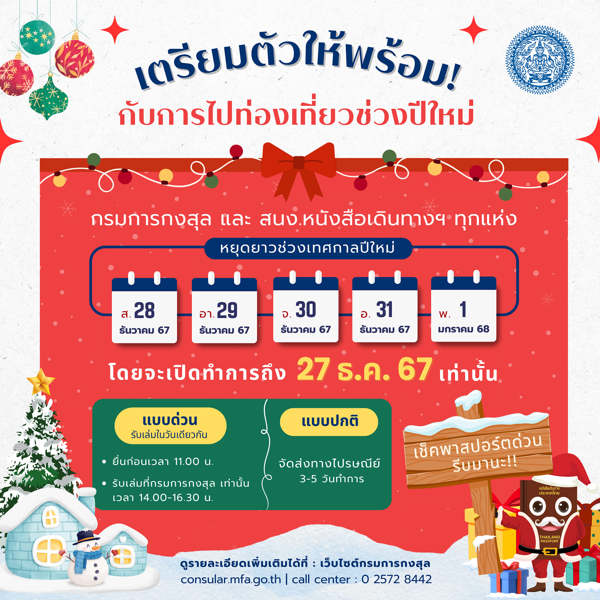 กรมการกงสุล ร่วมกับ สำนักงานหนังสือเดินทางฯ ทุกแห่ง แจ้งหยุดยาวช่วงเทศกาลปีใหม่