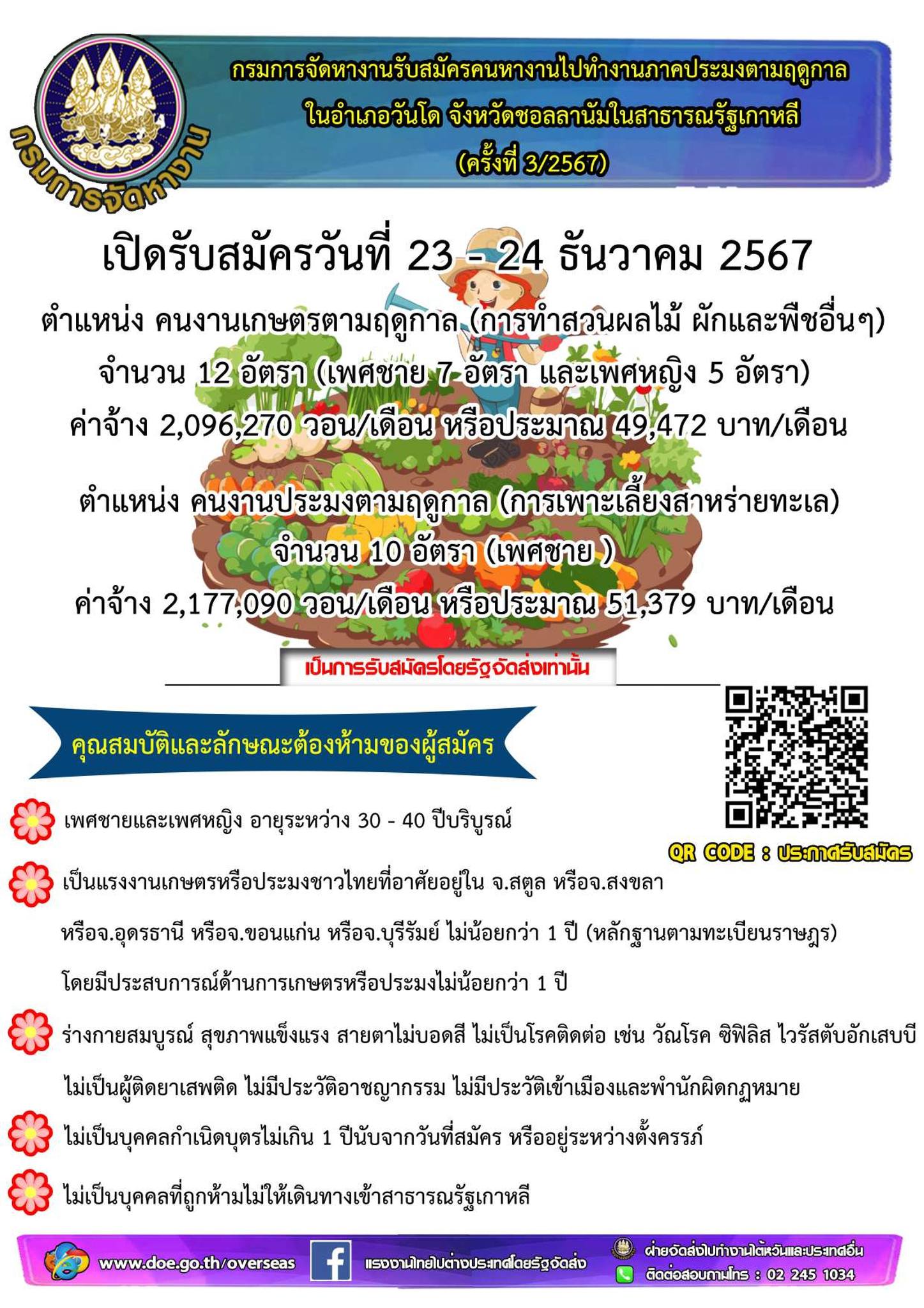 กรมการจัดหางาน เปิดรับสมัครคนหางานเพื่อไปทำงานภาคประมงตามฤดูกาลในอำเภอวันโด จังหวัดชอลลานัม สาธารณรัฐเกาหลี (ครั้งที่ 3/2567) เปิดรับสมัครวันที่ 23 – 24 ธันวาคม 2567