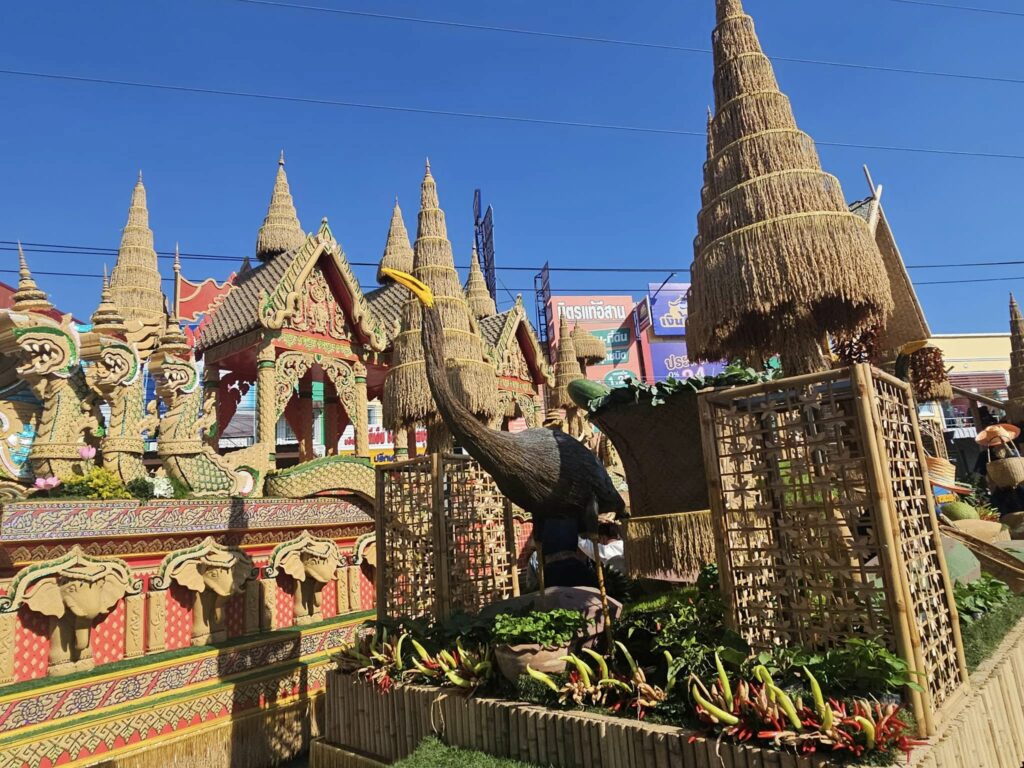 • ขบวนแห่ตกแต่งสุดอลังการด้วยเม็ดข้าวหอมมะลิและการฟ้อนรำที่งดงาม