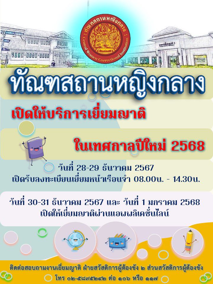 ทัณฑสถานหญิงกลาง เปิดให้บริการเยี่ยมญาติในเทศกาลปีใหม่ 2568 ข่าวสารกิจกรรม ทัณฑสถานหญิงกลาง เปิดให้บริการเยี่ยมญาติในเทศกาลปีใหม่ 2568 ทัณฑสถานหญิงกลาง เปิดให้บริการเยี่ยมญาติในเทศกาลปีใหม่ 2568 เปิดให้บริการเยี่ยมญาติ ในเทศกาลปีใหม่ 2568 วันที่ 28 – 29 ธันวาคม 2567 เปิดรับลงทะเบียนเยี่ยมหน้าเรือนจําา 08.00น. – 14.30น. วันที่ 30 – 31 ธันวาคม 2567 และ วันที่ 1 มกราคม 2568 เปิดให้เยี่ยมญาติผ่านแอพพลิเคชั่นไลน์ ติดต่อสอบถามงานเยี่ยมญาติ ฝ่ายสวัสดิการผู้ต้องขัง 2 ส่วนสวัสดิการผู้ต้องขัง โทร. 02-5895242 ต่อ 106 หรือ 117 ที่มา : https://shorturl.asia/LArK4 Post Views: 183 FacebookFacebookXTwitterLINELine