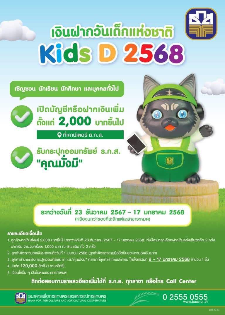 ธนาคารเพื่อการเกษตรและสหกรณ์การเกษตร ชวนน้องๆ ออมเงิน รับกระปุก“คุณมั่งมี” ผ่านแคมเปญเงินฝากวันเด็กแห่งชาติ “Kids D 2568” เนื่องในโอกาสวันเด็กแห่งขาติ 2568 เพื่อสร้างเสริมนิสัยการออมเงินในเด็กและเยาวชน นักเรียน นักศึกษา ตลอดจนบุคคลทั่วไป ผ่านการฝากเงินในแคมเปญเงินฝากวันเด็กแห่งชาติ “Kids D 2568”
