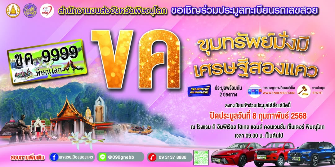 กองทุนเพื่อความปลอดภัยในการใช้รถใช้ถนน ขอเชิญร่วมประมูลทะเบียนรถเลขสวย จังหวัดพิษณุโลก หมวดอักษร ขค “ขุมทรัพย์มั่งมี เศรษฐีสองแคว” เริ่มประมูลวันที่ 8 กุมภาพันธ์ 2568 ณโรงแรม ดิ อิมพีเรียล โฮเทล แอนด์ คอนเวนชั่น เซ็นเตอร์ พิษณุโลก และทางระบบอินเทอร์เน็ต www.tabienrod.com