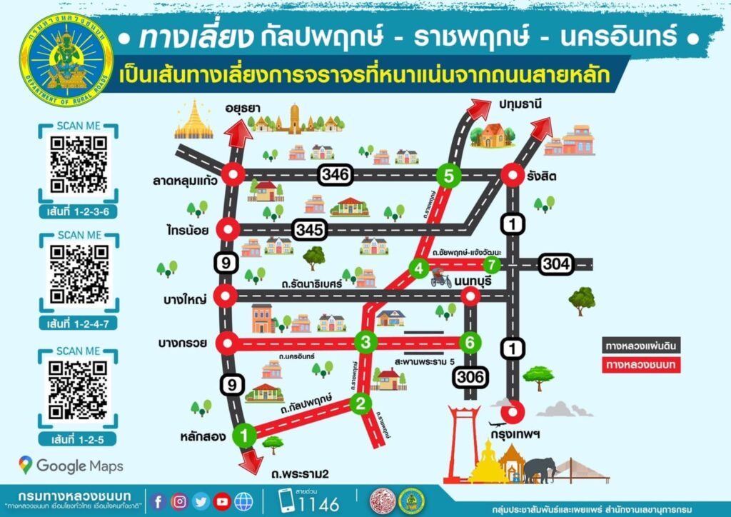 กรมทางหลวงชนบท (ทช.) จึงขอแนะนำเส้นทางเลี่ยง จำนวน 7 เส้นทาง ซึ่งเป็นเส้นทางเลี่ยงการจราจรหนาแน่นบนถนนสายหลัก เพื่อให้ประชาชนสามารถวางแผนก่อนการเดินทาง ดังนี้