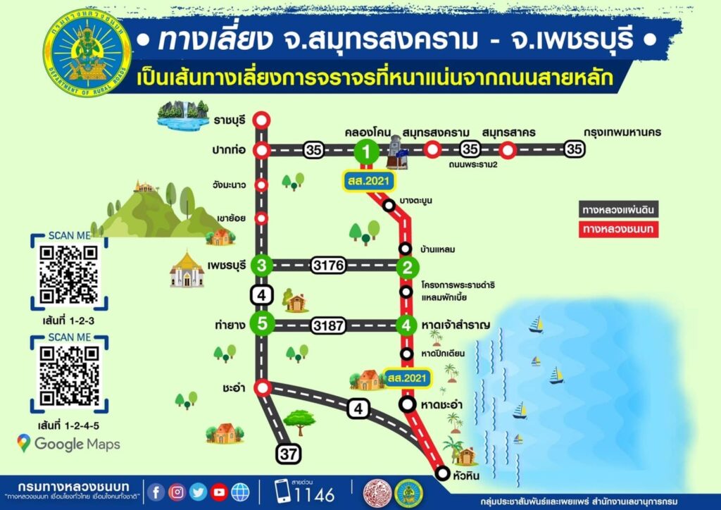 - เส้นทางเลี่ยง ทล.4 (ถนนเพชรเกษม) เริ่มจาก ทล.35 กม.ที่ 73+070 (จุดที่ 1) เลี้ยวซ้ายเข้าสู่ทางหลวงชนบทสาย สส.2021 เดินทางต่อเป็นระยะทาง 23.7 กิโลเมตร จนถึง กม.ที่ 23+700 เลี้ยวขวาเข้าสู่ ทล.3176 (จุดที่ 2) เดินทางต่อเป็นระยะทาง 12.6 กิโลเมตร เพื่อเข้าสู่จังหวัดเพชรบุรี (จุดที่ 3) และสามารถเลี่ยงการจราจรจากจังหวัดเพชรบุรีไปยังอำเภอชะอำ โดยเริ่มจากทางหลวงชนบทสาย สส.2021 (จุดที่ 2) เดินทางต่อเป็นระยะทาง 36.3 กิโลเมตร จนถึง กม.ที่ 60+000 เลี้ยวขวาเข้าสู่ ทล.3187 (จุดที่ 4) เดินทางต่อเป็นระยะทาง 18.5 กิโลเมตร เลี้ยวซ้ายเข้าสู่ ทล.4 กม.ที่ 169+070 (จุดที่ 5) เพื่อมุ่งสู่อำเภอชะอำ จังหวัดเพชรบุรี