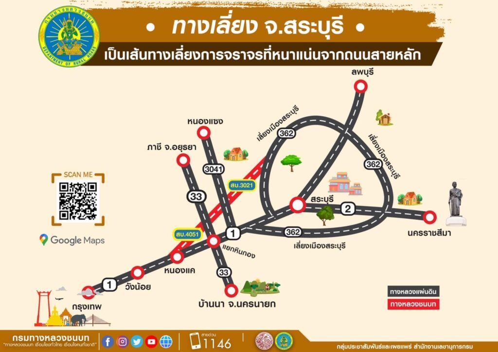 - เริ่มจาก ทล.1 (ถนนพหลโยธิน) กม.ที่ 80+000 ใช้เส้นทางคู่ขนานไปบรรจบกับ ทล.3220 กม.ที่ 83+800 เดินทางต่อเป็นระยะทาง 1.5 กิโลเมตร บรรจบกับทางหลวงชนบทสาย สบ.4051 เดินทางต่อเป็นระยะทาง 3 กิโลเมตร บรรจบกับทางหลวงชนบท สาย สบ.3021 เดินทางต่อเป็นระยะทาง 19 กิโลเมตร วิ่งตรงผ่านไฟแดง ไปจนบรรจบกับ ทล.362 กม.ที่ 3+290 แล้วเลี้ยวซ้ายมุ่งสู่จังหวัดลพบุรีและจังหวัดเพชรบูรณ์ต่อไป