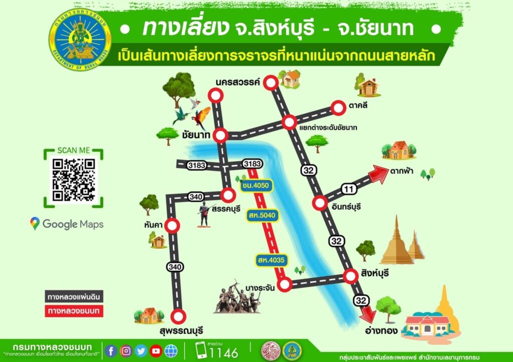 - เส้นทางเลี่ยง ทล.32 เริ่มจาก ทล.32 กม.ที่ 87+800 เลี้ยวซ้ายเข้าสู่ ทล.335 และ ทล.369 เดินทางต่อเป็นระยะทาง 4 กิโลเมตร เลี้ยวขวาเข้าสู่ ทล.3030 กม.ที่ 1+000 เดินทางต่อเป็นระยะทาง 9.8 กิโลเมตร บรรจบกับทางหลวงชนบทสาย สห.4035 เดินทางต่อเป็นระยะทาง 7.3 กิโลเมตร บรรจบกับทางหลวงชนบทสาย สห.5040 เดินทางต่อเป็นระยะทาง 4.6 กิโลเมตร บรรจบกับทางหลวงชนบทสาย ชน.4050 เลี้ยวซ้ายเข้าสู่ ทล.3183 กม.ที่ 3+730 เดินทางต่อเป็นระยะทาง 1.6 กิโลเมตร และเลี้ยวขวาเข้าสู่ ทล.340 กม.ที่ 160+610 เพื่อเดินทางเข้าสู่จังหวัดชัยนาท