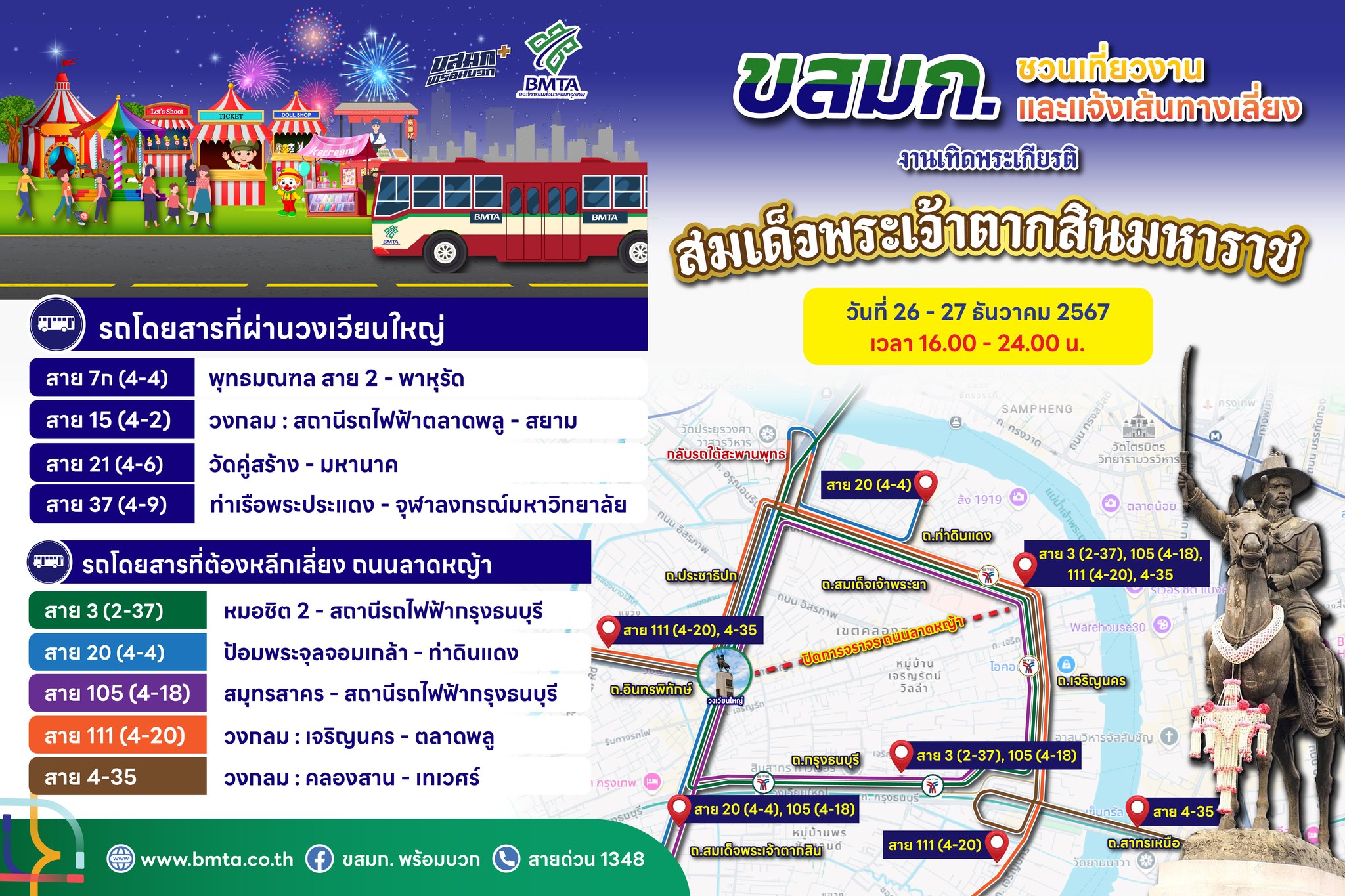 ขสมก. ขอเชิญชวนเที่ยวงานเทิดพระเกียรติสมเด็จพระเจ้าตากสินมหาราช ประจำปี พ.ศ. 2567 ด้วยรถโดยสารประจำทางของ ขสมก. มีรถโดยสารประจำทางที่วิ่งผ่านงานดังกล่าวที่สามารถเชื่อมต่อกับระบบขนส่งสาธารณะอื่น ๆ และหลีกเลี่ยงเส้นทางในวันจัดงานฯ เนื่องจากมีการปิดถนนลาดหญ้าตั้งแต่บริเวณ วงเวียนใหญ่ ถึงซุ้มประตูไทย-ซิกข์ รถโดยสารประจำทางที่วิ่งผ่านงาน มี 9 เส้นทาง ดังนี้