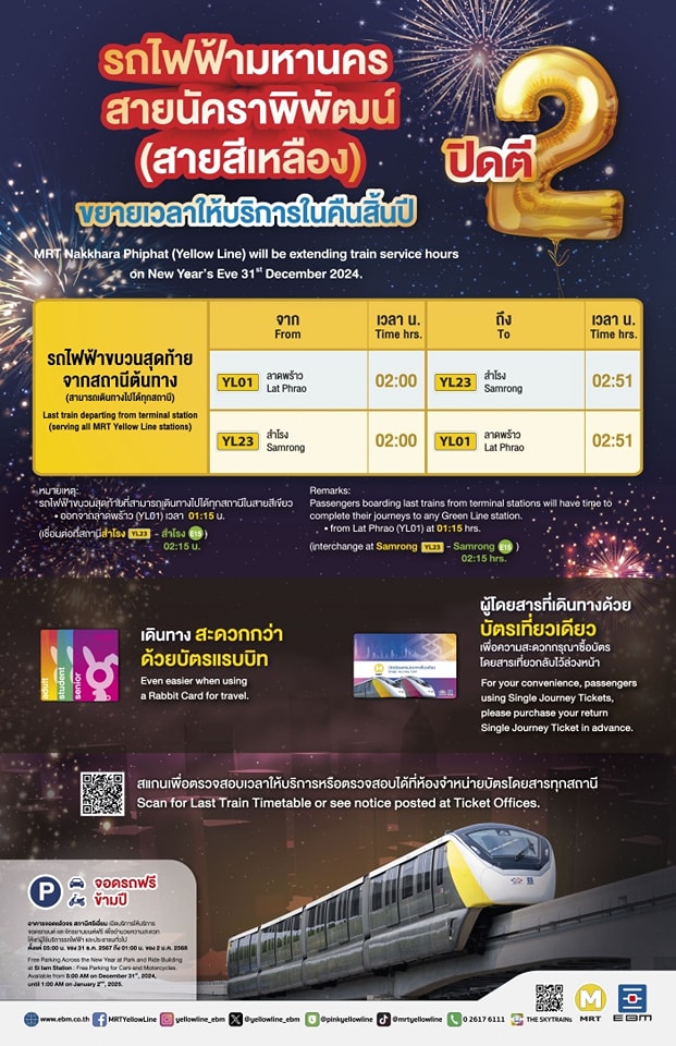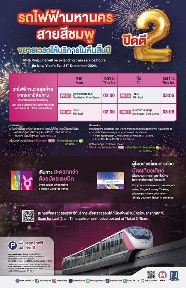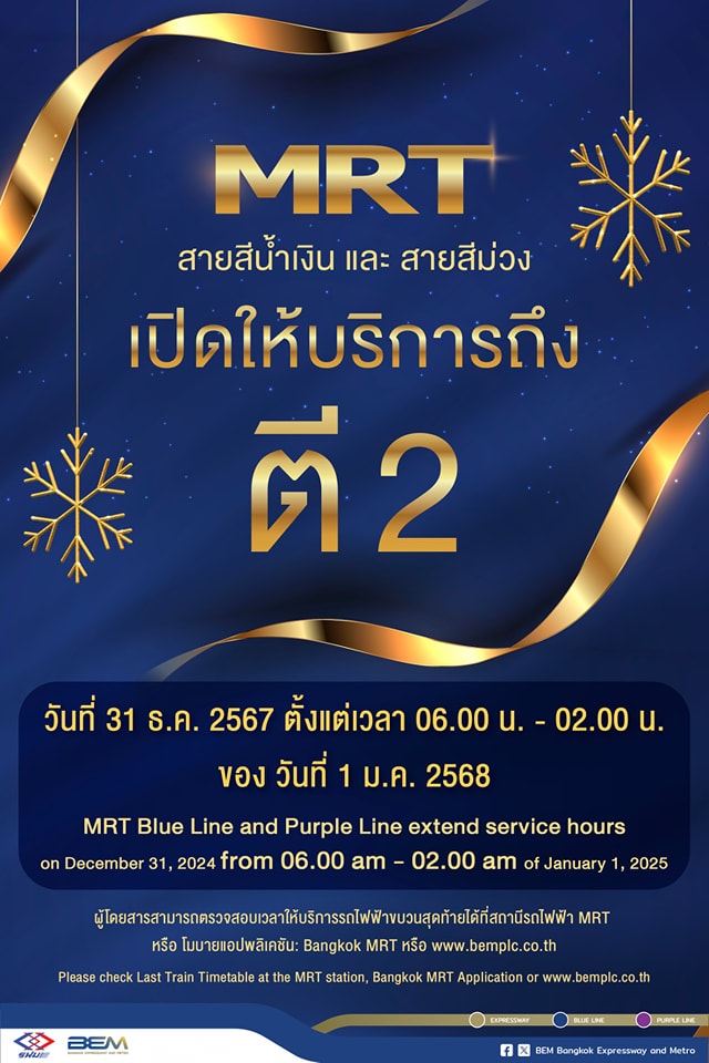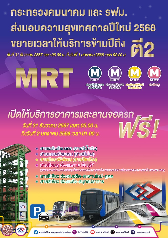 การรถไฟฟ้าขนส่งมวลชนแห่งประเทศไทย ส่งมอบความสุขเทศกาลปีใหม่ 2568 ขยายเวลาให้บริการรถไฟฟ้ามหานคร 4 สาย เพื่ออำนวยความสะดวกให้ประชาชนเดินทางไปเฉลิมฉลองที่สถานที่สำคัญในกรุงเทพฯ สนับสนุนให้ประชาชนใช้บริการขนส่งสาธารณะและจอดรถยนต์ที่อาคารและลานจอดแล้วจรที่ใกล้สถานีรถไฟฟ้า โดยให้บริการจนถึงเวลา 02.00 น. ของวันที่ 1 มกราคม 2568 พร้อมทั้งยกเว้นค่าจอดรถในอาคารและลานจอดแล้วจรของรถไฟฟ้าซึ่งจะให้บริการตั้งแต่เวลา 05.00 น. ของวันที่ 31 ธันวาคม 2567 ถึงเวลา 01.00 น. ของวันที่ 2 มกราคม 2568 (ยกเว้น MRT สายสีชมพูที่ให้บริการจนถึง 02.00 น. ของวันที่ 2 มกราคม 2568) โดยสามารถติดตามข้อมูลและสอบถามรายละเอียดการบริการได้ที่ศูนย์บริการข้อมูลหรือแอปพลิเคชันของแต่ละสายรถไฟฟ้า