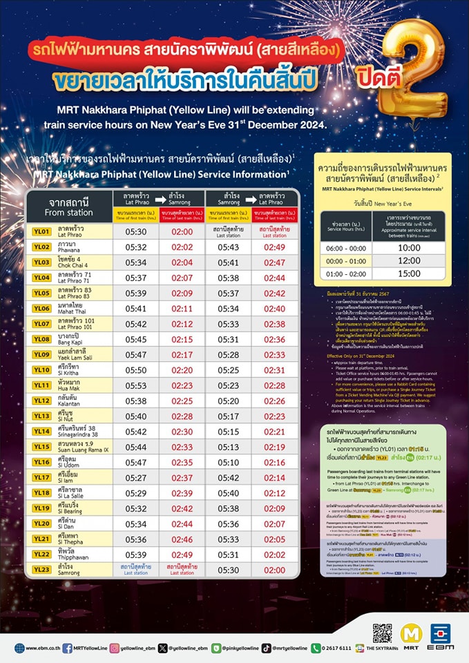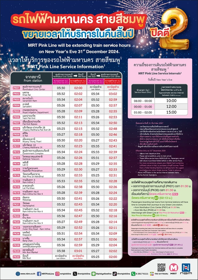 ในการนี้ กระทรวงคมนาคม และ รฟม. พร้อมด้วยผู้รับสัมปทานเดินรถไฟฟ้ามหานครทั้ง 4 สาย ได้แก่ บริษัท ทางด่วนและรถไฟฟ้ากรุงเทพ จำกัด (มหาชน) (BEM) ผู้ให้บริการเดินรถไฟฟ้ามหานคร สายเฉลิมรัชมงคล (MRT สายสีน้ำเงิน) และรถไฟฟ้ามหานคร สายฉลองรัชธรรม (MRT สายสีม่วง) บริษัทอีสเทิร์น บางกอกโมโนเรล จำกัด (EBM) ผู้ให้บริการเดินรถไฟฟ้ามหานคร สายนัคราพิพัฒน์ (MRT สายสีเหลือง) และ บริษัท นอร์ทเทิร์น บางกอกโมโนเรล จำกัด (NBM) ผู้ให้บริการเดินรถไฟฟ้ามหานคร สายสีชมพู (MRT สายสีชมพู) มีความตั้งใจจะส่งมอบขวัญในเทศกาลปีใหม่ 2568 โดยขยายเวลาสิ้นสุดการให้บริการรถไฟฟ้า MRT สายสีม่วง สายสีน้ำเงิน สายสีเหลือง และสายสีชมพู ในวันที่ 31 ธันวาคม 2567 เวลา 06:00 น. ถึงวันที่ 1 มกราคม 2568 เวลา 02:00 น. โดยรถไฟฟ้าเที่ยวสุดท้ายจะออกจากสถานีต้นทาง/ปลายทาง ในเวลา 02.00 น.
