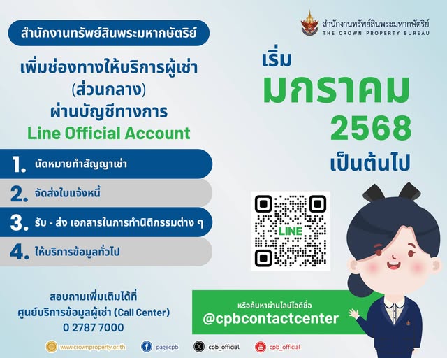 สำนักงานทรัพย์สินพระมหากษัตริย์ เพิ่มช่องทางให้บริการผู้เช่า (ส่วนกลาง) ผ่านบัญชีทางการ Line Official Account ชื่อบัญชี @cpbcontactcenter เริ่มดำเนินการตั้งแต่เดือนมกราคม 2568 เป็นต้นไป