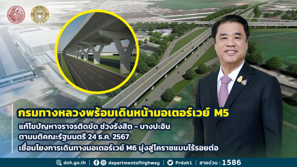 กรมทางหลวง พร้อมเดินหน้ามอเตอร์เวย์ M5 แก้ไขปัญหาจราจรติดขัด ช่วงรังสิต – บางปะอิน เชื่อมโยงการเดินทางมอเตอร์เวย์ M6 มุ่งสู่โคราชแบบไร้รอยต่อ