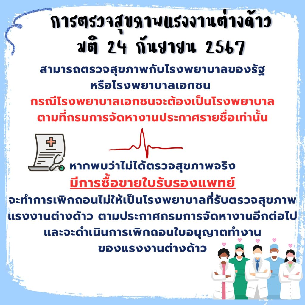 กระทรวงแรงงาน แจ้งแนวทางสำหรับการตรวจสุขภาพของแรงงานต่างด้าว ตามมติคณะรัฐมนตรีเมื่อวันที่ 24 กันยายน 2567
