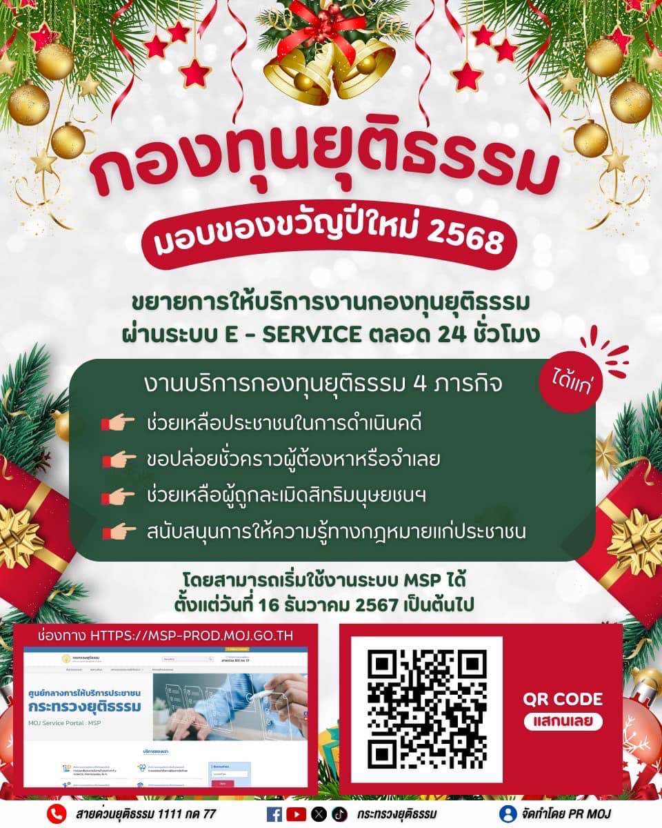 กองทุนยุติธรรม มอบของขวัญปีใหม่ 2568 ข่าวสารกิจกรรม กองทุนยุติธรรม มอบของขวัญปีใหม่ 2568 กองทุนยุติธรรม มอบของขวัญปีใหม่ 2568 กองทุนยุติธรรม มอบของขวัญปีใหม่ 2568 ขยายการให้บริการงานกองทุนยุติธรรม ผ่านระบบ E – SERVICE ตลอด 24 ชั่วโมง งานบริการกองทุนยุติธรรม 4 ภารกิจได้แก่ช่วยเหลือประชาชนในการดําเนินคดีขอปล่อยชั่วคราวผู้ต้องหาหรือจําเลยช่วยเหลือผู้ถูกละเมิดสิทธิมนุษยชนฯสนับสนุนการให้ความรู้ทางกฎหมายแก่ประชาชนโดยสามารถเริ่มใช้งานระบบ MSP ได้ ตั้งแต่วันที่ 16 ธันวาคม 2567 เป็นต้นไป ที่มา : https://shorturl.asia/zZBam Post Views: 9 FacebookFacebookXTwitterLINELine