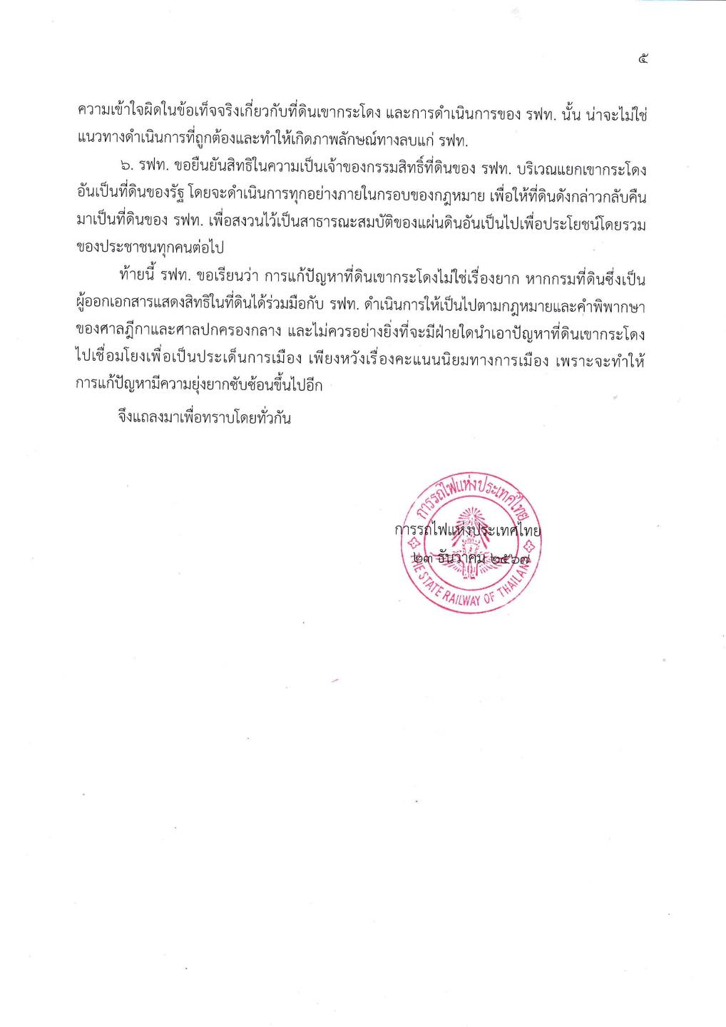 พร้อมขอขอยืนยันว่า สิทธิในความเป็นเจ้าของกรรมสิทธิ์ที่ดินของ รฟท. บริเวณแยกเขากระโดง อันเป็นที่ดินของรัฐ โดยจะดำเนินการทุกอย่างภายในกรอบของกฎหมาย เพื่อให้ที่ดินดังกล่าวกลับคืนมาเป็นที่ดินของ รฟท. เพื่อสงวนไว้เป็นสาธารณะสมบัติของแผ่นดินอันเป็นไปเพื่อประโยชน์โดยรวมของประชาชนทุกคนต่อไป